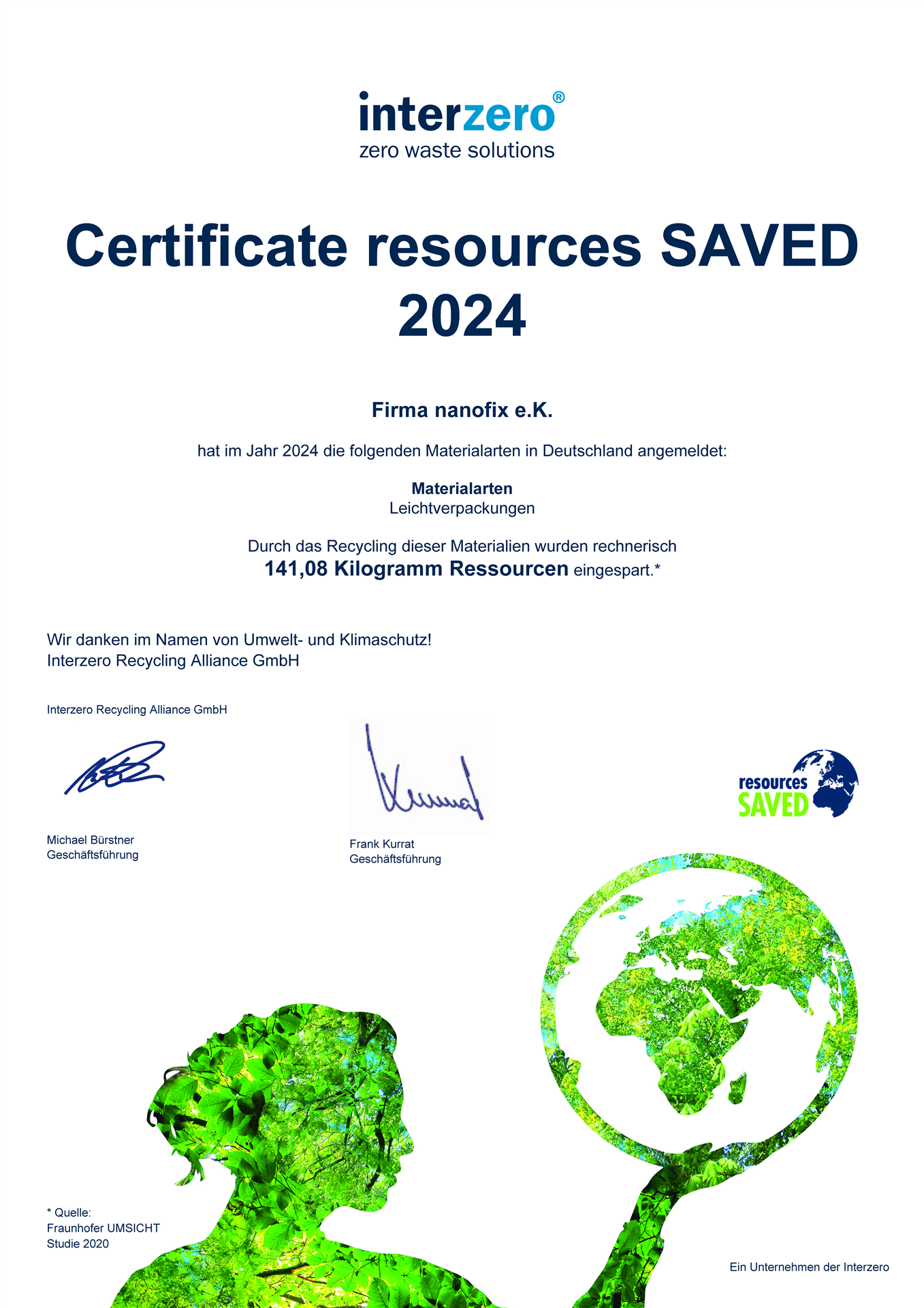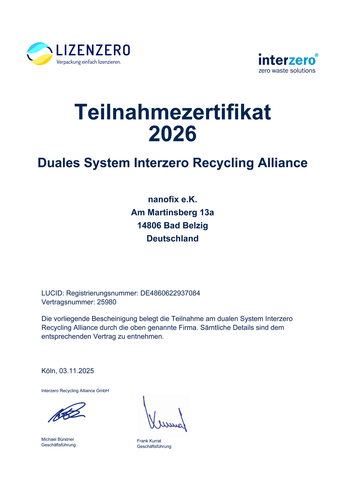 Der nanofix e.K. ist unter der Nr.: DE4860622937084 bei der Stiftung Zentrale Stelle Verpackungsregister gemäß §9 VerpackG (Verpackungsregister LUCID) gelistet. Unsere Rücknahmepflichten erfüllen wir durch Beteiligung an einem dualen System oder durch Beteiligung an einer oder mehreren Branchenlösungen.